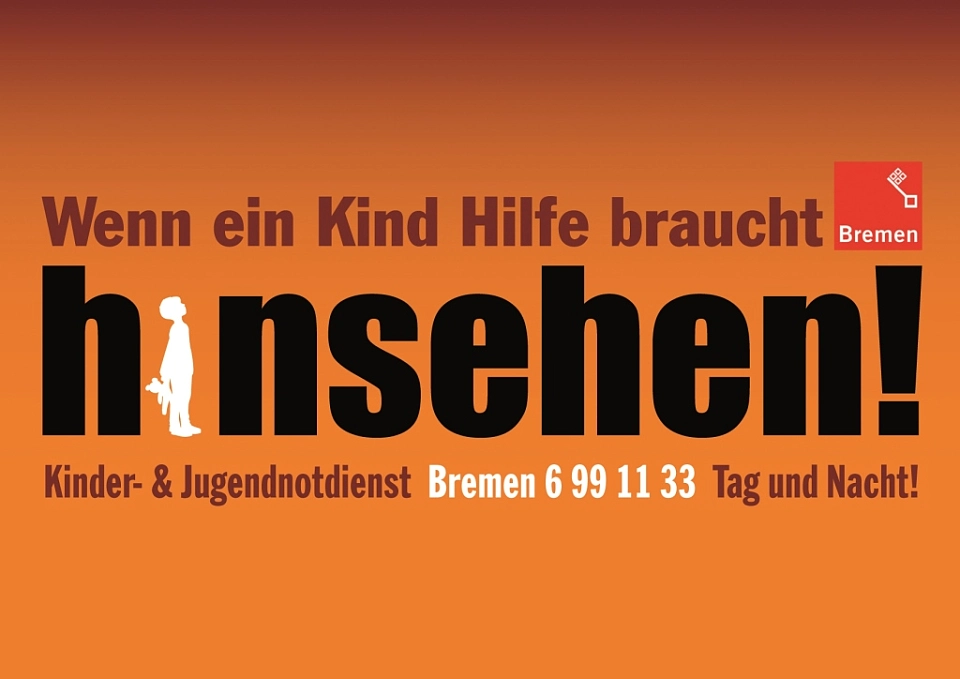 Karte zum Bremer Kinder- und Jugendnotdienst Nr. 6 99 11 33 unter dem Motto: Hinsehen! Wenn ein Kind Hilfe braucht