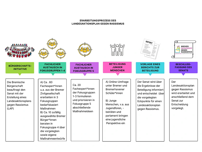 Zur Erstellung des Landesaktionsplan gegen Rassismus wurde ein Beteiligungsprozess durchgeführt, der die Bedarfe aus der Zivilgesellschaft und von anderen Akteur*innen spiegeln soll. Für diesen partizipativen Ansatz wurden 5 Fokusgruppen eingerichtet, in denen ausgewählte Expert*innen der Zivilgesellschaft, Verwaltung, Wirtschaft, Wissenschaft zusammenkamen. Die unterschiedlichen Hintergründe der Teilnehmenden stellten sicher, dass verschiedenste Perspektiven und Erfahrungen abgebildet wurden. Dabei stand die konkrete Situation im Themenfeld Rassismus im Land Bremen im Fokus. Das Format der Fokusgruppen erlaubte dabei einen inhaltlich tiefergehenden Austausch, in dessen Zuge Bedürfnisse und Prioritäten identifiziert und als Handlungsvorschläge konkretisiert werden konnten.