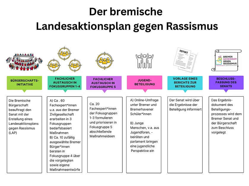 Die Senatorin für Arbeit, Soziales, Jugend und Integration setzt den Auftrag der Bremischen Bürgerschaft an den Senat (pdf, 416.5 KB) um, einen maßnahmenorientierten Landesaktionsplan gegen Rassismus zu entwickeln.